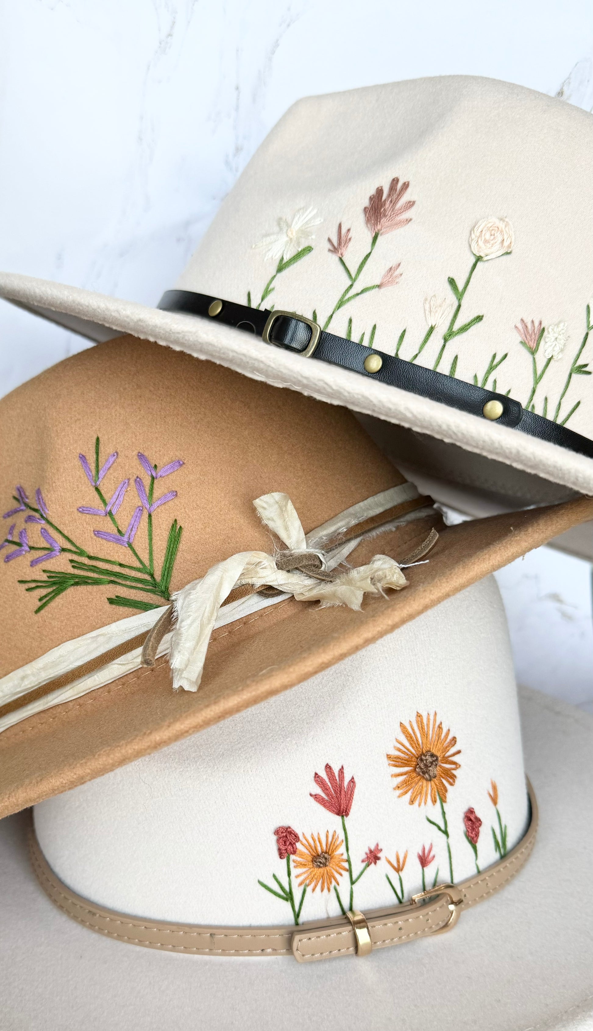 Hand embroidered, unique, floral embroidered wide brim felt hats. These are great hats for family photos, concerts, outdoor get togethers, vacation, sun hat, and more! Super cute and stylish for all occasions.